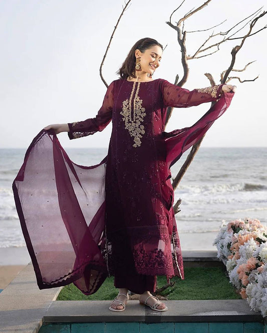 Chocolate Viscose Georgette Chikankari Kurta & Pant With Dupatta Set