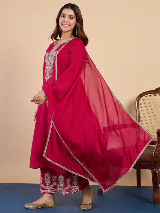 Rani Pink Silk Blend Embroidered with Sequins Straight Kurta Palazzo Dupatta Set