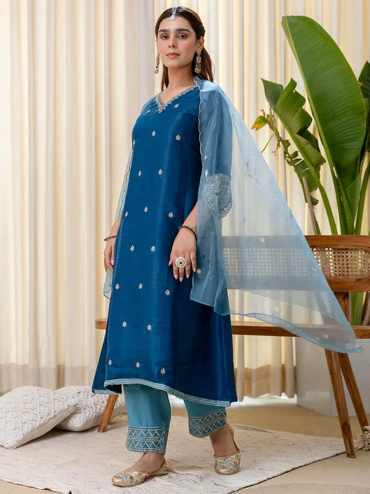 Meher Teal-blue Embroidred Kurta Sets with Sequins Work Women Suits