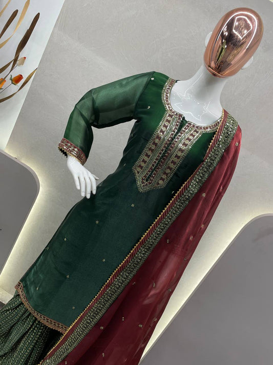 Trending Fancy Jimi Chuu Top Sequence Embroidery Work With Dupatta And Sarara