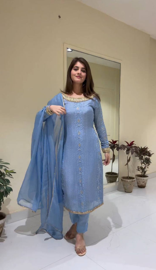 Heavy Organza Suit Set with Matching Pants and Embroidered Dupatta