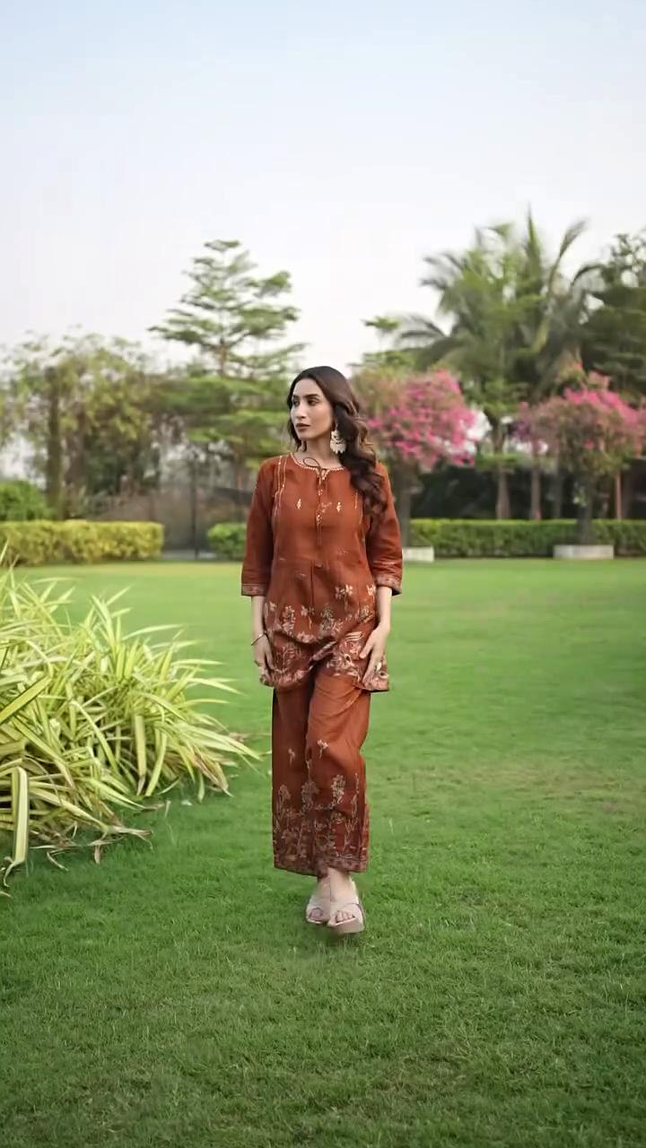 The top, detailed with intricate handwork And printed Top, whispers elegance with every thread. Featuring a classic Mandarin collar and soft 3/4 sleeves, it drapes in a relaxed fit that feels as effortless as it looks.