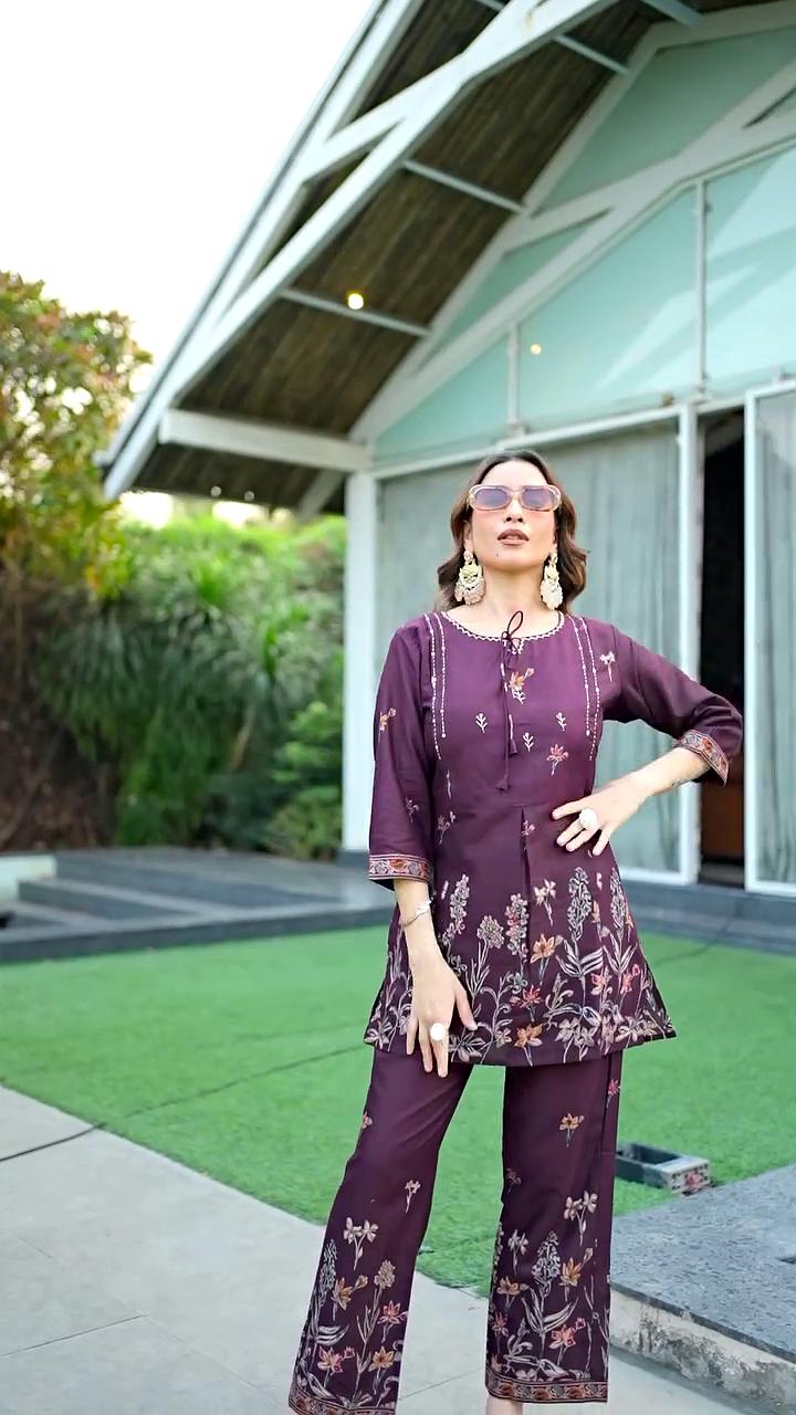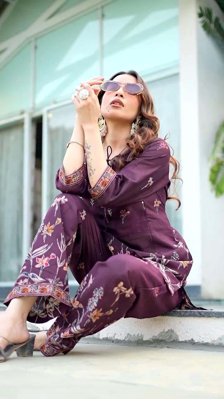 The top, detailed with intricate handwork And printed Top, whispers elegance with every thread. Featuring a classic Mandarin collar and soft 3/4 sleeves, it drapes in a relaxed fit that feels as effortless as it looks.